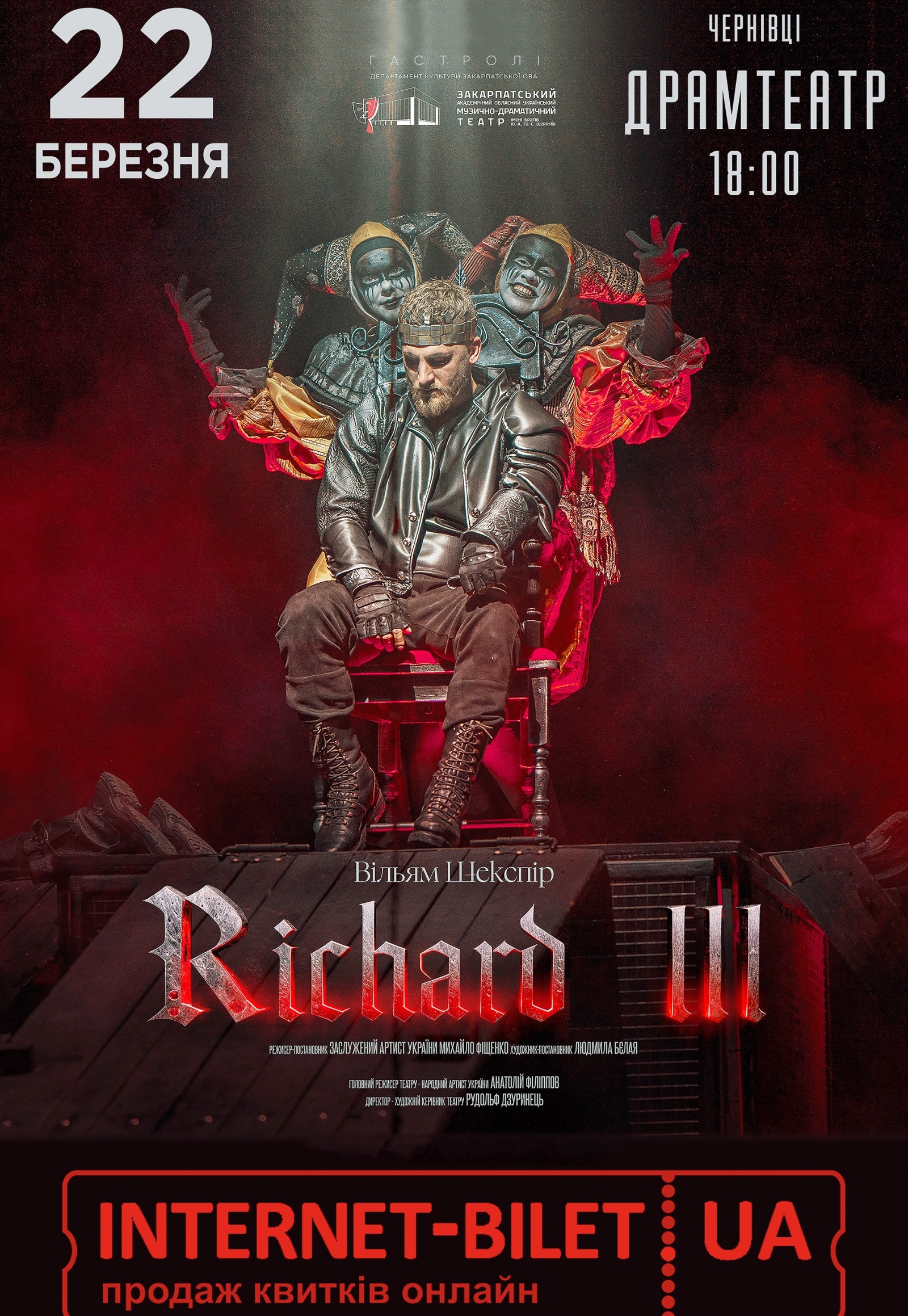 Спектакль "Richard III" состоится 22 марта 2026, 18:00, воскресенье в Черновецкий драмтеатр им. О. Кобылянской. С помощью сервиса internet-bilet.ua, Вы сможете с легкостью забронировать, заказать и купить билеты на интересующий Вас концерт, спектакль, оперу, балет, мастер-классы, спортивные и детские мероприятия, оплатив их самым удобным для Вас способом: через интернет банковской картой VISA/MasterCard, наличными или курьером, если сделаете заказ билета c доставкой.