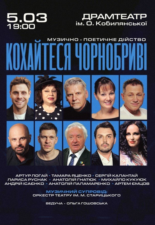 Кохайтеся Чорнобриві - музично-поетичне дійство відбудеться 5 березня 2026, 19:00, четвер в Чернівецький драмтеатр ім. О. Кобилянської. За допомогою сервісу internet-bilet.ua, Ви зможете з легкістю забронювати, замовити та купити квитки на концерт, спектакль, оперу, балет, майстер-класи, спортивні та дитячі заходи, що Вас цікавлять, оплативши їх найбільш зручним для Вас способом: через інтернет банківською карткою VISA/MasterCard, готівкою або кур'єром, якщо зробите замовлення квитка з доставкою.
